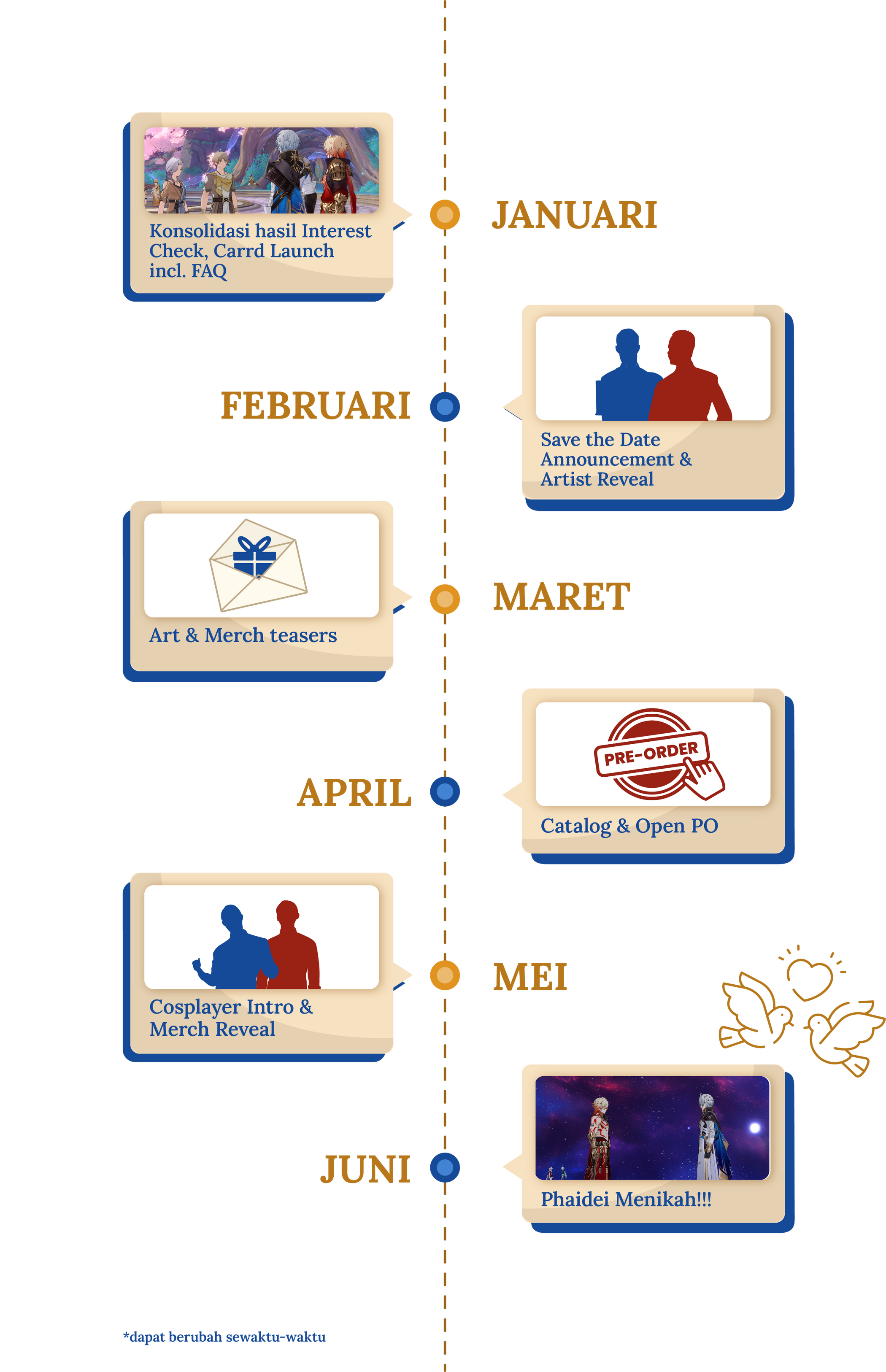 A: Kami ingin yang menjadi pusat perhatian adalah cosplayer Phainon dan Mydei. Untuk tamu, maksimal hanya boleh wigplay yah (dilarang wigplay Phainon dan Mydei). Kostumnya bisa berpakaian seperti tamu kondangan saja ya. :)Q: Apakah akan ada dress code?